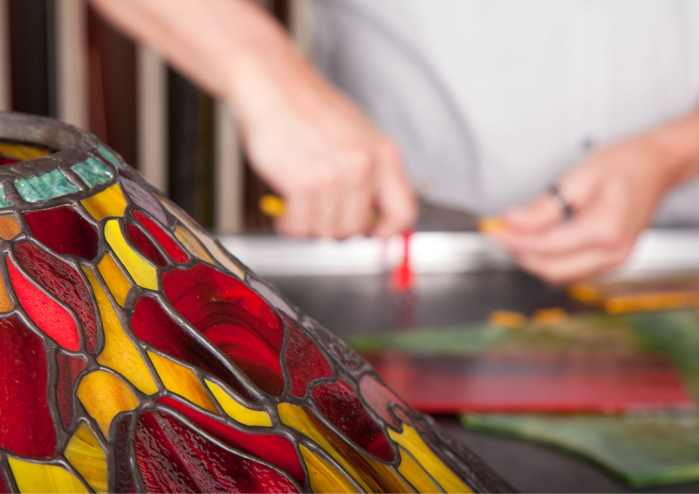 Glaskurs för nybörjare och längre hunna. Du får lära dig att bearbeta glas: skära, slipa och löda. Vi arbetar med olika tekniker som tiffany och mosaik.