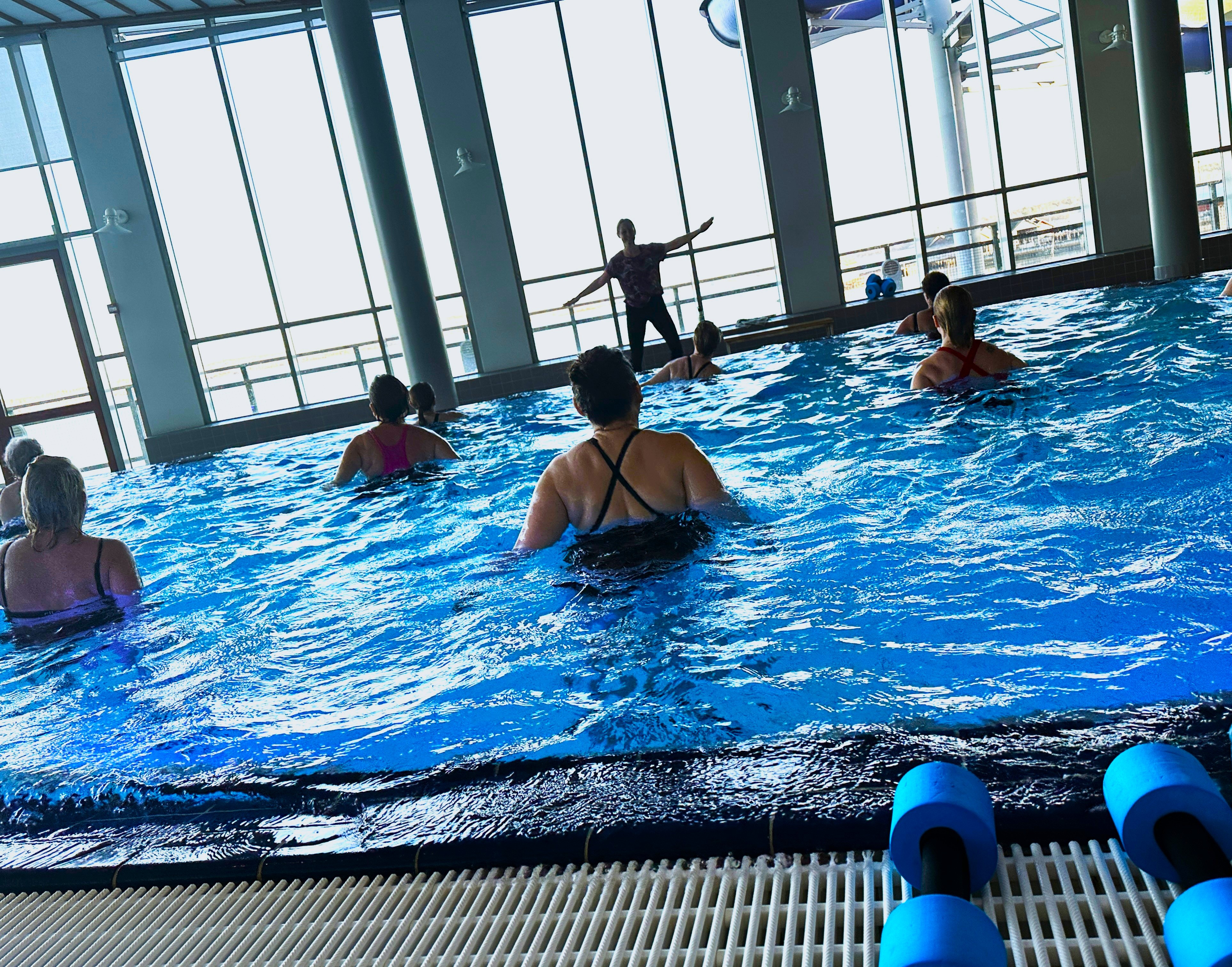 Aqua Zumba är en träningsform där vi tar det välkända Zumba Fitness ner i poolen! De klassiska stegen i Zumba Fitness är modifierade till att anpassas för att just du ska kunna dansa i vattnet. Aqua Zumba är en bra träningsform då det är mildare mot din kropp och tränas med hjälp av vattenmotståndet, vilket gör att denna träningsform även passar gravida, äldre och personer med annan problematik. De positiva effekterna med Aqua Zumba är att dina muskler blir uthålligare som i sin tur ökar din muskelstyrka, energiförbrukningen ökar och kardiovaskulära systemet samt andningssystemet tränas m.m. I vattnet har vi ett motstånd som är 12 gånger större än på land men som knappt märks då vi väl är i gång!